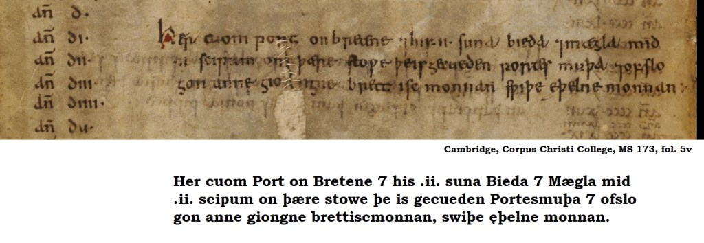 In this year, Port came to Britain along with his two sons Bieda and Mægla in two ships to the place that is called Portsmouth and they killed a young British man, a very noble man.